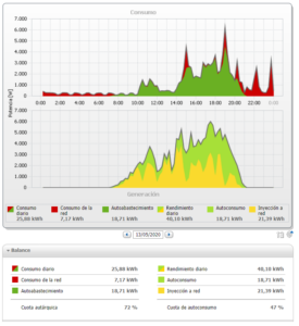 En la galería de fotos podrás observar una captura de pantalla de un dispositivo móvil, donde se puede ver una pantalla de la aplicación de monitorización. En esta pantalla podemos ver la producción y los consumos del día, reflejados en una gráfica donde vemos a qué hora se producen. Con esta información podemos saber las horas que nuestra instalación produce más y, por tanto, aprovechar ese período de tiempo para realizar tareas que requieran de energía eléctrica como poner lavadoras, encender horno, etc. Otra ventaja de esta monitorización es que podemos tener controlada nuestra instalación aunque estemos ausentes, solo necesitamos el teléfono y una conexión a internet.